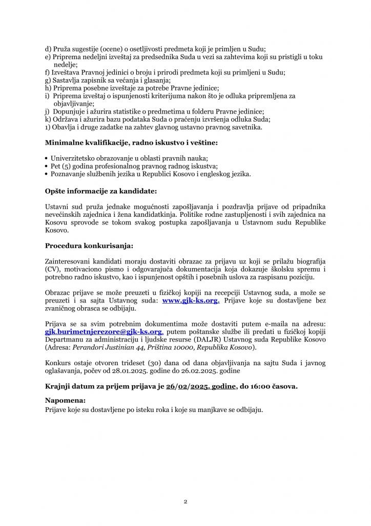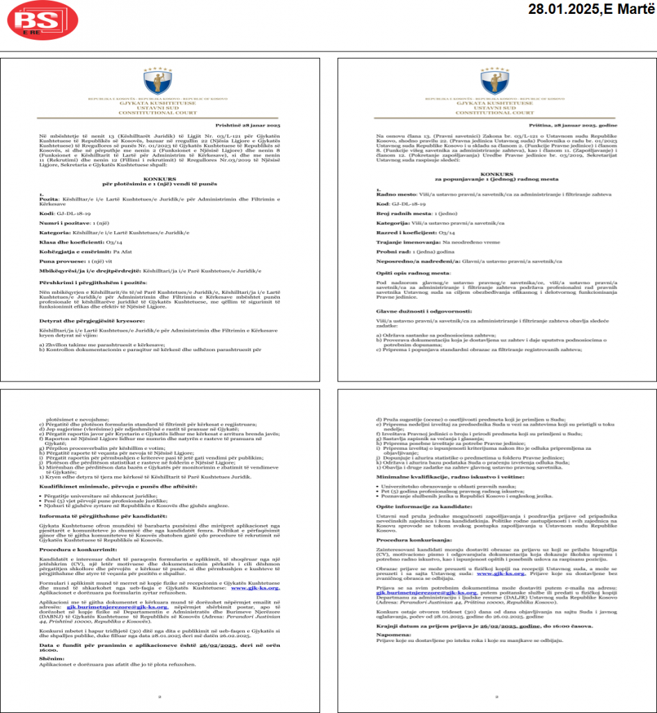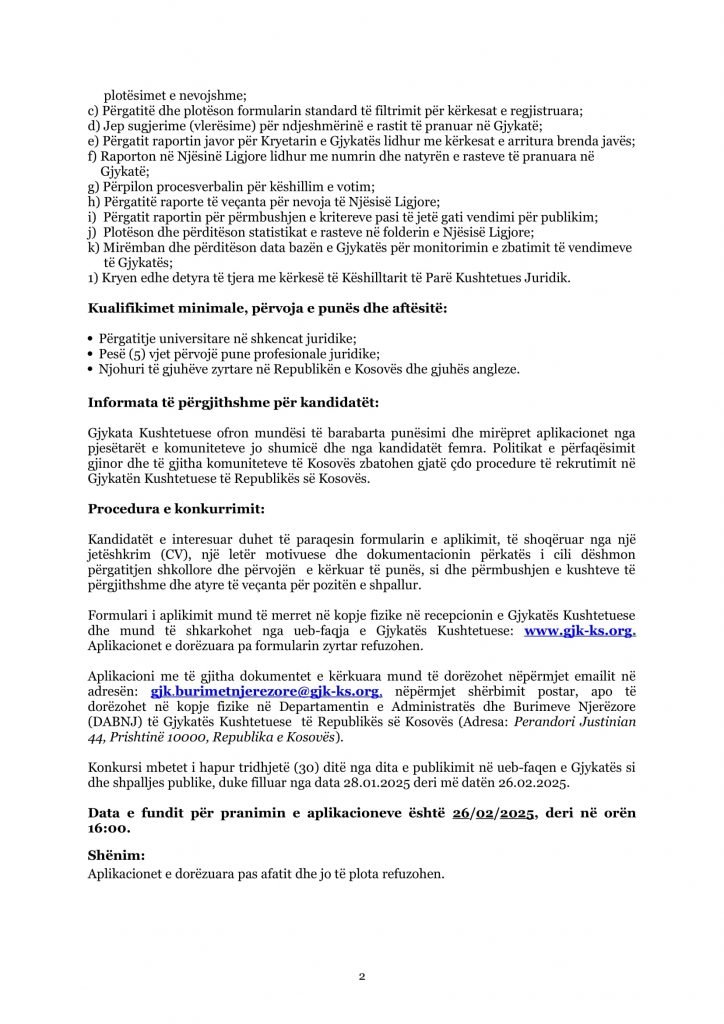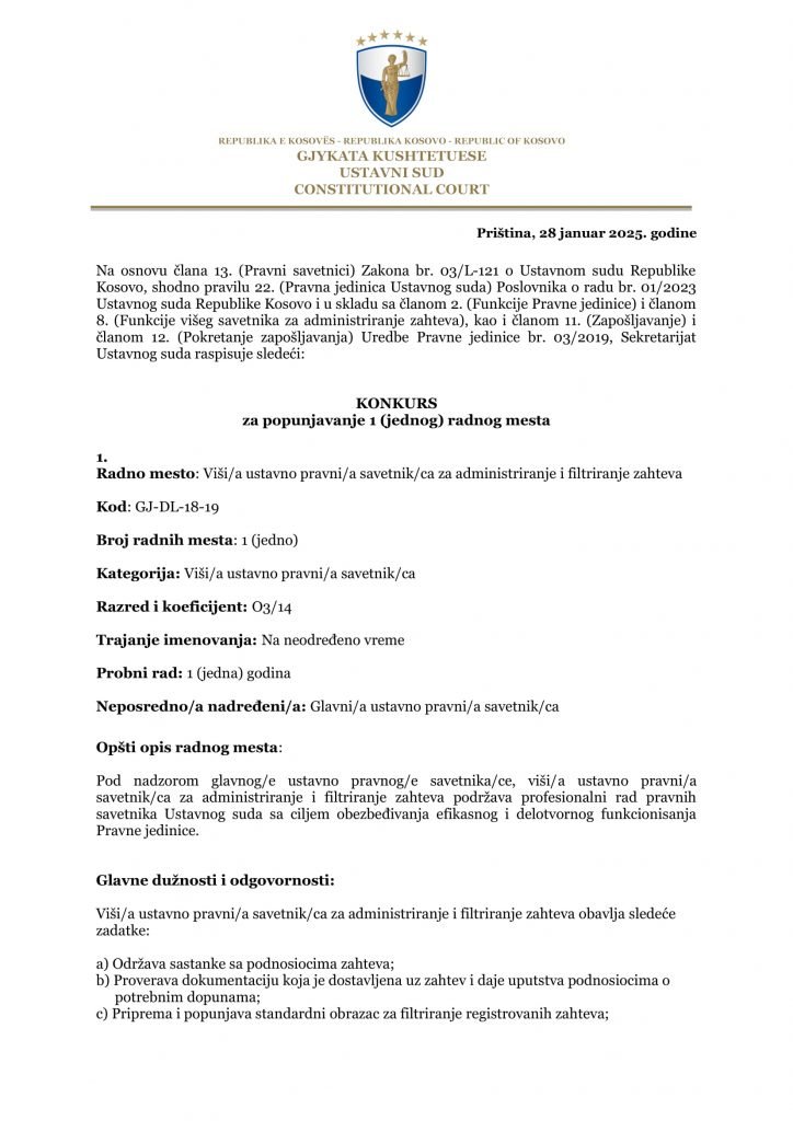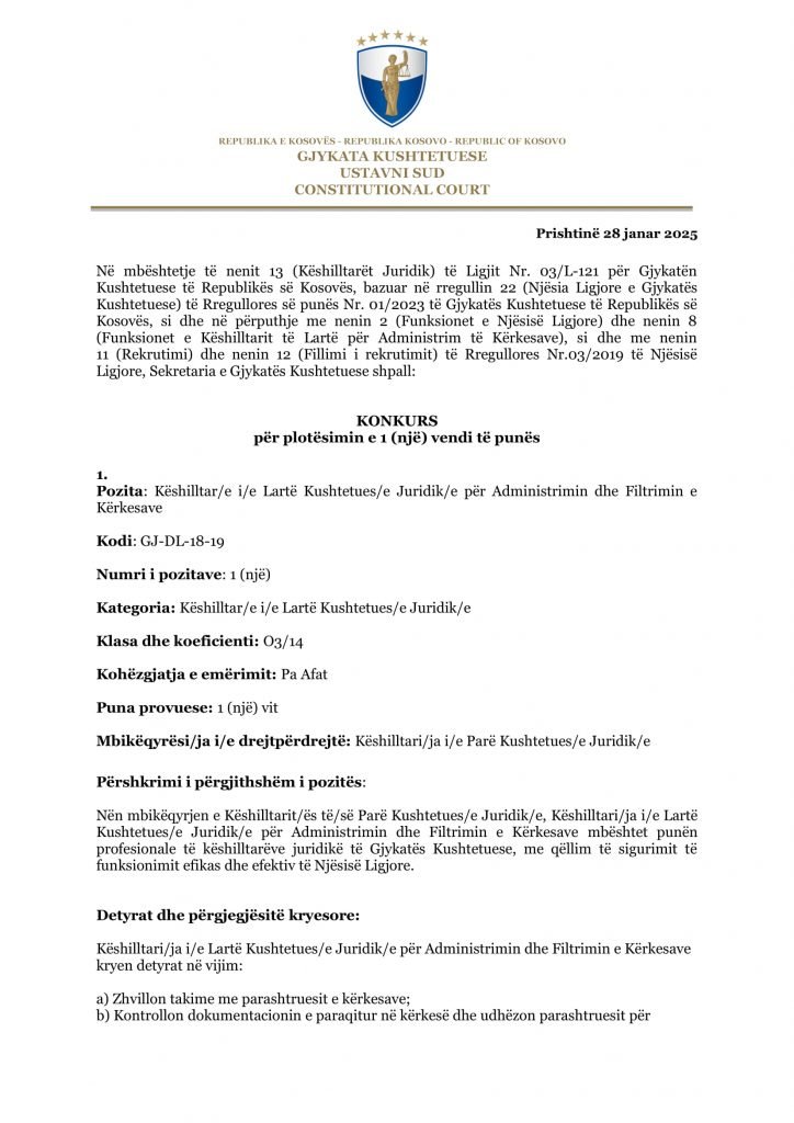 HomePublikime/KonkurseGjykata Kushtetuese e Republikës së Kosovës-Konkurs- Këshilltar/e i/e Lartë Kushtetues/e Juridik/e... Publikime/Konkurse Gjykata Kushtetuese e Republikës së Kosovës-Konkurs- Këshilltar/e i/e Lartë Kushtetues/e Juridik/e për Administrimin dhe Filtrimin e Kërkesave By Bota Sot e Re January 28, 2025, 7:00 0 235 Share FacebookTwitterPinterestWhatsApp Share FacebookTwitterPinterestWhatsApp Previous articleShpallje të pavlefshmeNext articleDështon të nisë gjykimi ndaj Nagip Krasniqit për shkak se mungoi Ymer Dragusha, seanca shtyhet Bota Sot e Re RELATED ARTICLES Publikime/Konkurse Shpallje të pavlefshme April 23, 2026, 21:43 Publikime/Konkurse Njoftim – Mbyllje Biznesi”Jusuf Dekor”Sh.p.k April 22, 2026, 19:03 Publikime/Konkurse Shpallje të pavlefshme April 22, 2026, 18:55 - Advertisment - Most Popular DASH falënderon Kosovën që e shpalli organizatë terroriste IRGC-në April 24, 2026, 11:41 Kurti citon deklaratën e Engel në Kuvend: Dua ta shoh Kosovën të njohur nga secili shtet në botë, dua ta shoh Kosovën në NATO April 24, 2026, 11:39 Kuvendi mblidhet në seancë solemne për kongresmenin Eliot Engel, mban një minutë heshtje April 24, 2026, 11:36 Policia po i heton dy raste të vdekjeve, një në Prizren e një në Mitrovicë të Veriut April 24, 2026, 9:25 Load more Recent Comments