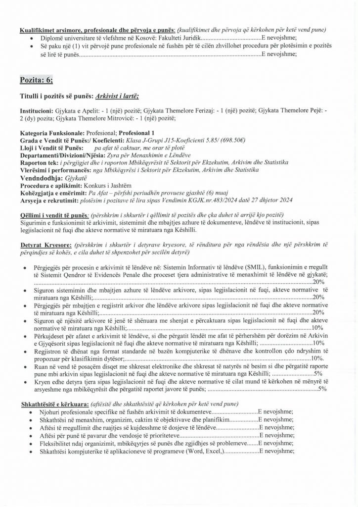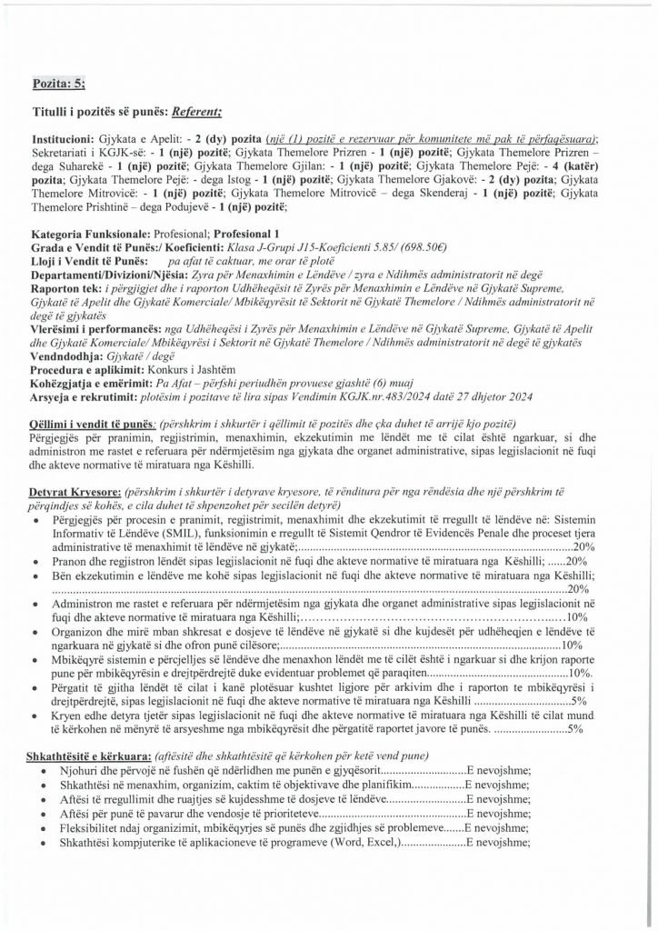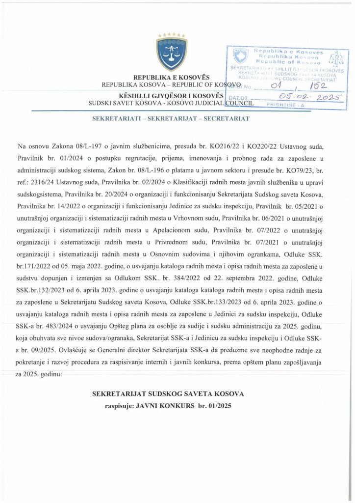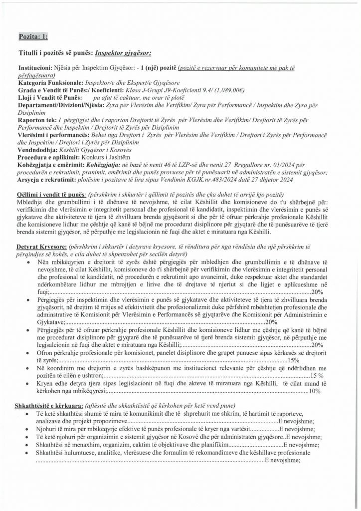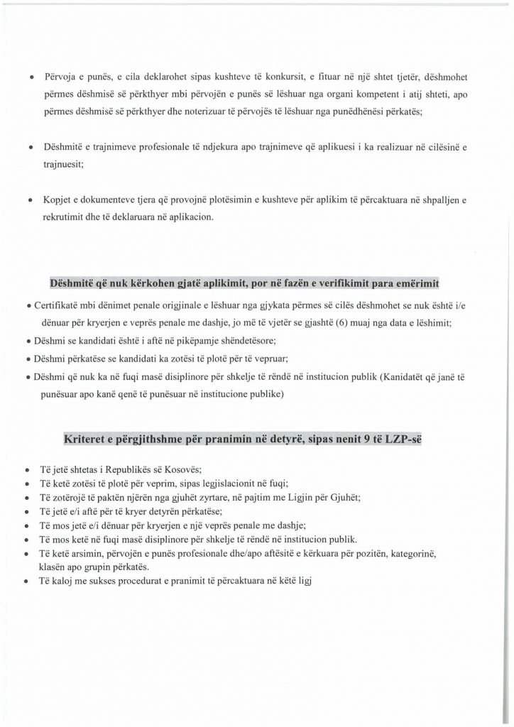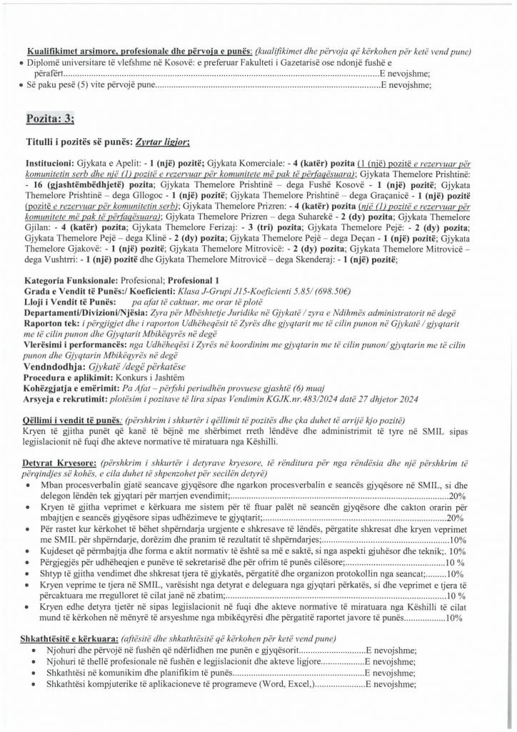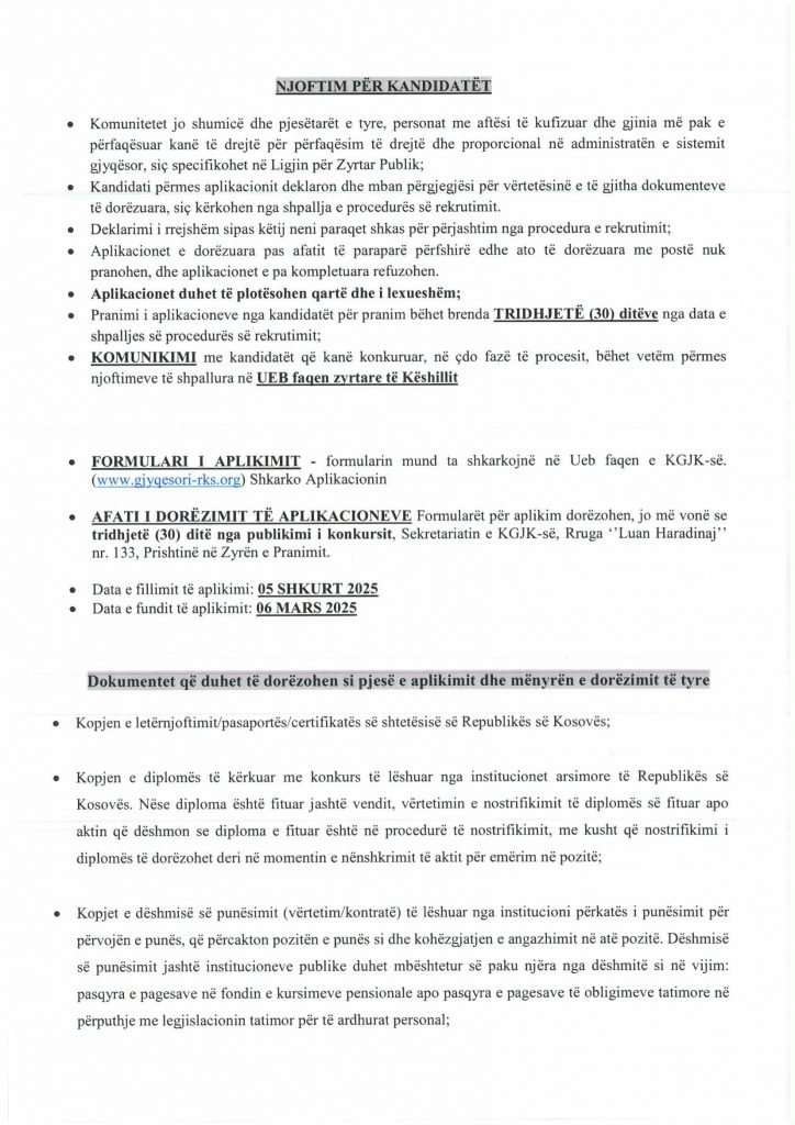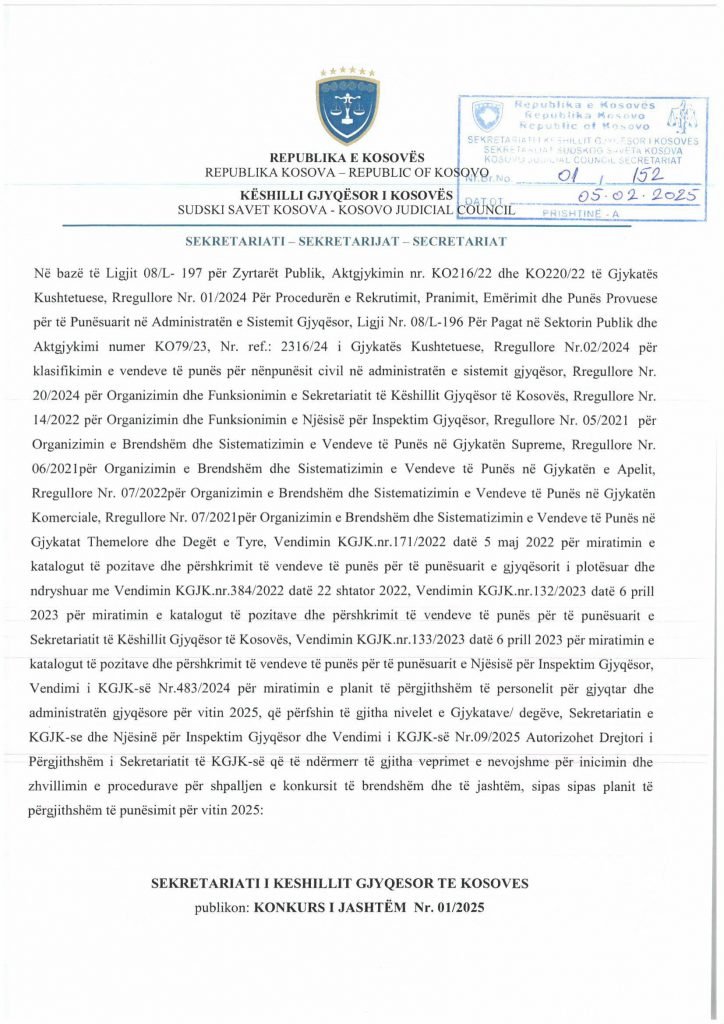 HomePublikime/KonkurseKëshilli Gjyqësor i Kosovës-Konkurs i Jashtëm Publikime/Konkurse Këshilli Gjyqësor i Kosovës-Konkurs i Jashtëm By Bota Sot e Re February 5, 2025, 14:00 0 334 Share FacebookTwitterPinterestWhatsApp Faqja PDF 1 Faqja PDF 2 Faqja PDF 3 Faqja PDF 4 Faqja PDF 5 Faqja PDF 6 Faqja PDF 7 Faqja PDF 8 Faqja PDF 9 Faqja PDF 10 Faqja PDF 11 Share FacebookTwitterPinterestWhatsApp Previous article“Kjo është toka jonë, nuk mund të jetojmë diku tjetër”, palestinezët në Gaza kundërshtojnë planin e TrumpitNext articlePrishtina njofton qytetarët: Faturat e Ndërmarrjes ‘‘Pastrimi’’ nga 1 janari, s’jeni të obliguar t’i paguani Bota Sot e Re RELATED ARTICLES Publikime/Konkurse Shpallje të pavlefshme April 23, 2026, 21:43 Publikime/Konkurse Njoftim – Mbyllje Biznesi”Jusuf Dekor”Sh.p.k April 22, 2026, 19:03 Publikime/Konkurse Shpallje të pavlefshme April 22, 2026, 18:55 - Advertisment - Most Popular DASH falënderon Kosovën që e shpalli organizatë terroriste IRGC-në April 24, 2026, 11:41 Kurti citon deklaratën e Engel në Kuvend: Dua ta shoh Kosovën të njohur nga secili shtet në botë, dua ta shoh Kosovën në NATO April 24, 2026, 11:39 Kuvendi mblidhet në seancë solemne për kongresmenin Eliot Engel, mban një minutë heshtje April 24, 2026, 11:36 Policia po i heton dy raste të vdekjeve, një në Prizren e një në Mitrovicë të Veriut April 24, 2026, 9:25 Load more Recent Comments