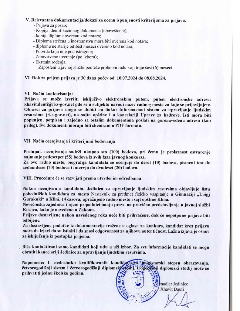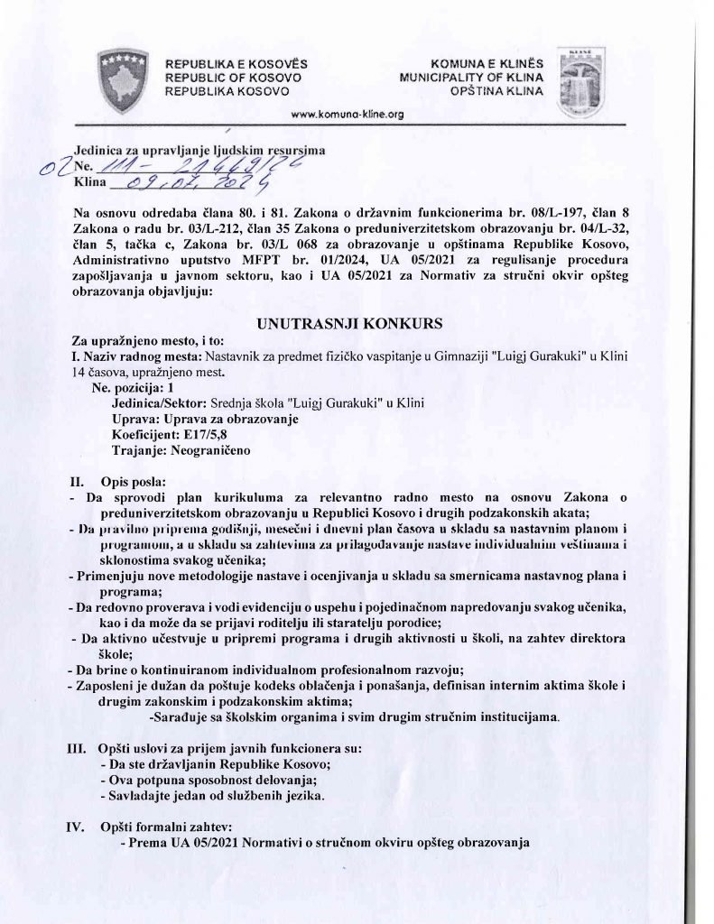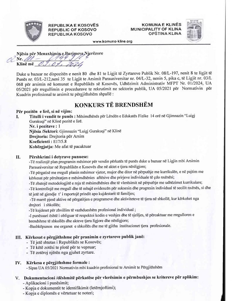 HomePublikime/KonkurseKomuna e Klinës-Konkurs i Brendshëm - Mësimdhënës për Lëndën e Edukatës Fizike Publikime/Konkurse Komuna e Klinës-Konkurs i Brendshëm – Mësimdhënës për Lëndën e Edukatës Fizike By Bota Sot e Re July 9, 2024, 10:58 0 238 Share FacebookTwitterPinterestWhatsApp PDF Share FacebookTwitterPinterestWhatsApp Previous articlePolicia jep 2107 gjoba trafiku për 7 ditë aktivitete në rajonin e PrizrenitNext articleJim O’Brien për Asociacionin e komunave: Ka rreth 400 në gjithë Evropën, mund të merret ndonjë model Bota Sot e Re RELATED ARTICLES Publikime/Konkurse Shpallje të pavlefshme December 21, 2025, 20:46 Publikime/Konkurse Shpallje të pavlefshme December 17, 2025, 20:47 Publikime/Konkurse Shpallje të pavlefshme December 16, 2025, 22:23 - Advertisment - Most Popular Ekspertët ukrainas: Serbia në Kosovë po bën veprime si të Rusisë December 22, 2025, 8:34 Shefja e inteligjencës amerikane: Rusia nuk është e aftë të pushtojë Ukrainën, e lëre më Evropën December 22, 2025, 8:32 KOSTT: Konsumi i rrymës ka tejkaluar rekordet e mëparshme, apel për kursim December 22, 2025, 8:31 Sot seanca gjyqësore ndaj të akuzuarve për vrasjen e Liridona Ademajt December 22, 2025, 8:30 Load more Recent Comments