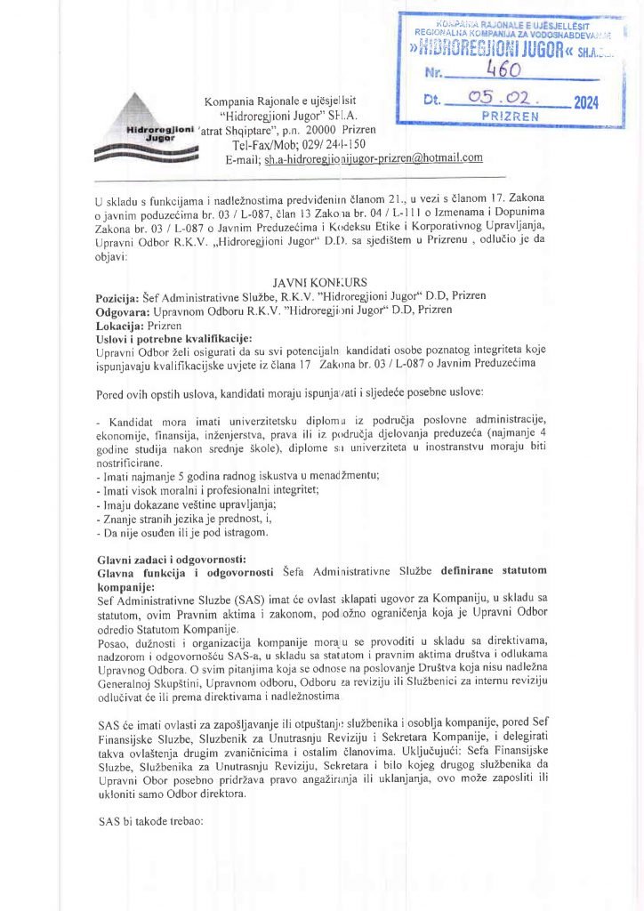 HomePublikime/KonkurseKRU "Hidroregjioni Jugor" SH.A - Konkurs Publikime/Konkurse KRU “Hidroregjioni Jugor” SH.A – Konkurs By Bota Sot e Re February 12, 2024, 7:00 0 365 Share FacebookTwitterPinterestWhatsApp PDF 1 PDF 2 Share FacebookTwitterPinterestWhatsApp Previous articleVedat Muriqi hero, ia jep fitoren Mallorcas në minutat shtesëNext article12 vjet nga tragjedia e Restelicës, momenti prekës kur u nxor e gjallë Amsera Reka Bota Sot e Re RELATED ARTICLES Publikime/Konkurse Shpallje të pavlefshme December 21, 2025, 20:46 Publikime/Konkurse Shpallje të pavlefshme December 17, 2025, 20:47 Publikime/Konkurse Shpallje të pavlefshme December 16, 2025, 22:23 - Advertisment - Most Popular Shpallje të pavlefshme December 21, 2025, 20:46 Lajm i mirë për Kosovën: Përfshihet në ligjin rekord të mbrojtjes së SHBA-së December 19, 2025, 11:17 Një delegacion i Këshillit të Evropës vjen në Kosovë për vëzhgimin e zgjedhjeve të parakohshme December 19, 2025, 11:15 SHBA kërkon zbatimin e Marrëveshjes së Ohrit mes Kosovës e Serbisë, kundërshton lëvizjen e kufijve në Ballkan December 19, 2025, 11:15 Load more Recent Comments