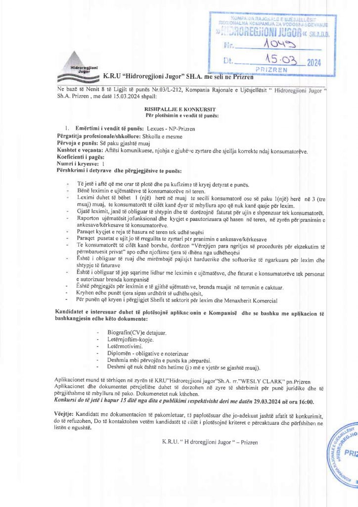 HomePublikime/KonkurseKRU 'Hidroregjioni Jugor" SH.A - Konkurs Publikime/Konkurse KRU ‘Hidroregjioni Jugor” SH.A – Konkurs By Bota Sot e Re March 15, 2024, 14:16 0 252 Share FacebookTwitterPinterestWhatsApp PDF konkursi Share FacebookTwitterPinterestWhatsApp Previous articleNë seancën e ish-deputeteve të Kuvendit të Kosovës, Teuta Haxhiu del para foltores me fotografinë e Liridona Ademajt të stampuar në bluzëNext articlePeci futet në zyra të AAK-së, ia “merr” zyrat partisë Bota Sot e Re RELATED ARTICLES Publikime/Konkurse Shpallje të pavlefshme December 21, 2025, 20:46 Publikime/Konkurse Shpallje të pavlefshme December 17, 2025, 20:47 Publikime/Konkurse Shpallje të pavlefshme December 16, 2025, 22:23 - Advertisment - Most Popular Pas kërkesës së Kelmendit për lirim nga detyra, Këshilli Prokurorial dërgon agjendën për mbledhje të jashtëzakonshme December 22, 2025, 13:59 ATK inkanson mbi 1 miliard euro tatime gjatë vitit 2025 December 22, 2025, 13:55 Pagë të 13-të në mars dhe “begatia” veçse e arritur ndaj të cilës “mos lëshoni pe”: Çka po premton Kurti? December 22, 2025, 13:55 DnV: Një pjesë e konsiderueshme e kandidatëve për deputetë janë nën 30 vjeç December 22, 2025, 13:53 Load more Recent Comments