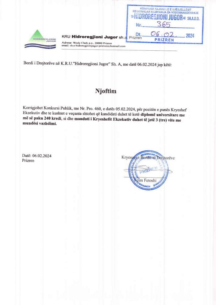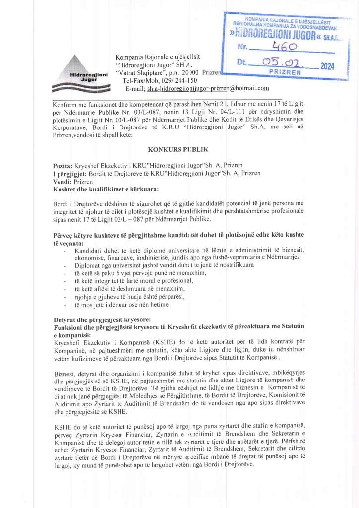 HomePublikime/KonkurseKRU "Hidroregjioni Jugor" SH.A - Konkurs Publikime/Konkurse KRU “Hidroregjioni Jugor” SH.A – Konkurs By Bota Sot e Re February 6, 2024, 10:52 0 285 Share FacebookTwitterPinterestWhatsApp PDF 1 PDF 2 Share FacebookTwitterPinterestWhatsApp Previous article“Elza ia doli”: 23-vjeçarja që u lëndua nga rënia e kulmit transferohet në Klinikën e NeurokirurgjisëNext article“The Guardian”: Kosova akuzohet për nxitje tensionesh pas vendimit të ndalimit të përdorimit të dinarit Bota Sot e Re RELATED ARTICLES Publikime/Konkurse Shpallje të pavlefshme December 24, 2025, 20:53 Publikime/Konkurse Shpallje të pavlefshme December 23, 2025, 20:50 Publikime/Konkurse Shpallje të pavlefshme December 22, 2025, 20:38 - Advertisment - Most Popular Rreth 500 mijë hyrje në Kosovë gjatë festave, rritje 8% e udhëtarëve ajrorë December 25, 2025, 8:42 SHBA-ja dhe Ukraina afrohen drejt një plani të përbashkët për t’i dhënë fund luftës – qëndrimi i Moskës ende i paqartë December 25, 2025, 8:40 Shpallje të pavlefshme December 24, 2025, 20:53 Pasaportat më të fuqishme në botë, e Kosovës ngritet për disa vende krahasuar me vitin e kaluar December 24, 2025, 9:43 Load more Recent Comments