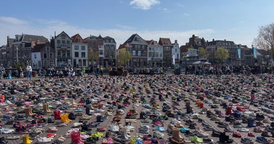 Ngjarja, e organizuar nga grupi holandez ‘Plant een Olijfboom’, u zhvillua në sheshin ‘Beestenpark’, ku u vendosën mijëra palë këpucë fëmijësh për të simbolizuar jetët e të rinjve të humbur në Gaza.