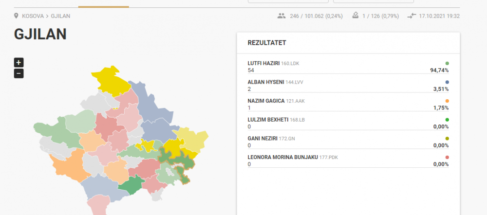 [20:22] – Sipas përditësimit të fundit në Gjilan të publikuara nga KQZ, diferenca në Gjilan është ngushtuar mes Lutfi Hazirit dhe Alban Hysenit.