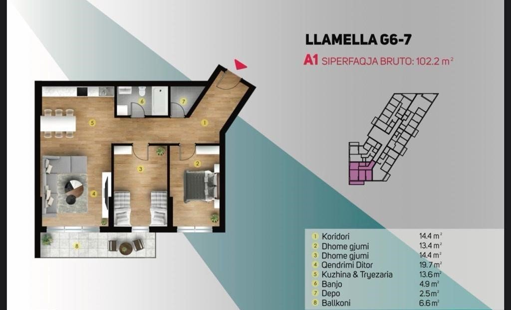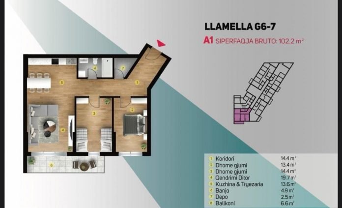 117.7m² | kati 5 | Qëndrim ditor | Kuzhinë | 3 dhoma gjumi | 2 banjo | Depo | Koridor | 2 terasa |